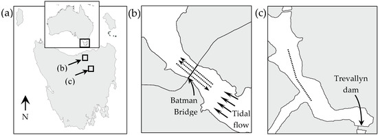 (a) The two experimental field sites in Tasmania, Australia (inset). (b) The Batman Bridge site with the direction of dominant tidal current flow as shown with solid straight-line arrows. AUV tracks are illustrated with dotted arrows. (c) The Lake Trevallyn site with low turbulence conditions. AUV missions were conducted along the dotted line.