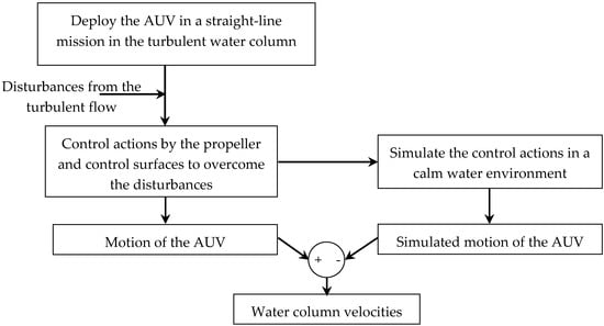 The WVAM method flowchart to predict water column velocities from the observed vehicle motions. As given in Equation (1), the difference between the motion responses in the turbulent (i.e., experimental) and calm (i.e., simulated) water flow condition provides a measurement of the water column velocities relative to the ground.
