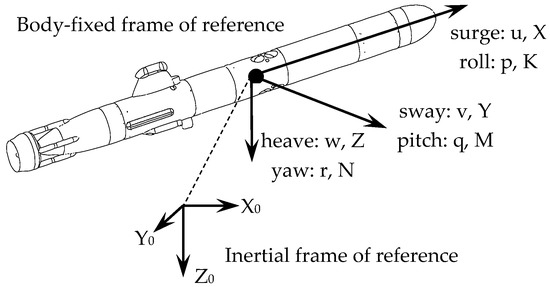 where, M is the system inertia matrix, is the Coriolis-centripetal matrix, is the damping matrix, is the vector of the gravitational/buoyancy forces and moments, τcontrol is the vector of propulsion, control surface forces, and moments, is the velocity vector (i.e., [u, v, w, p, q, r] where p, q, and r are the angular velocities around the x, y, and z axes), and is the vector of position/Euler angles (i.e., [x, y, z, φ, θ, ψ] where φ, θ and ψ are the roll, pitch, and yaw angles respectively). M and are further expanded in Equations (3) and (4), where, and are the rigid body force components of M and matrices, while and are their added mass components.