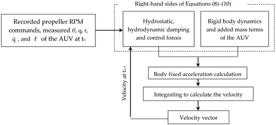As shown in the simulation model flowchart given in Figure 5, the instantaneous linear acceleration components of the current time-step is solved using the recorded input parameters (i.e., propeller RPM, θ, q, r, , and ) corresponding to the current time-step and linear vehicle velocities of the previous time-step. The calculated accelerations are then integrated with respect to time to obtain the linear velocity components in the body-fixed reference frame (i.e., u, v, and w), which is the key objective of the simulation model. These velocity components are also used as the input velocities for the future time-step.