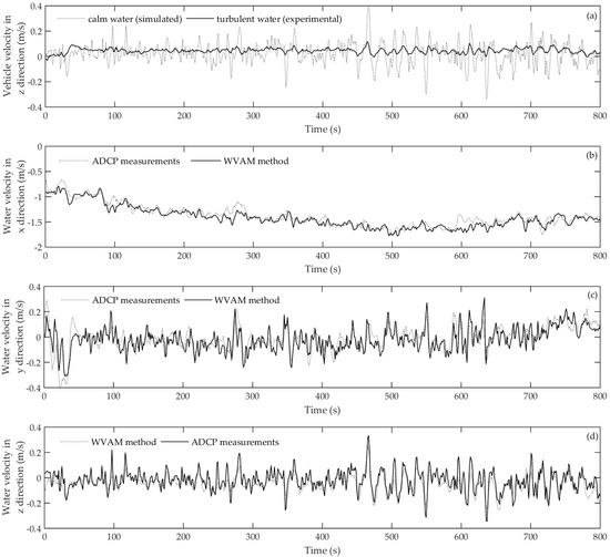 (a) The vertical velocity of the vehicle observed in the turbulent (experimental) and calm (simulated) water environments. The difference between the two responses provides the velocity of the water column in the z direction. The comparison between the velocity components of the water column in x, y and z axes (panels (b), (c), and (d), respectively) was calculated using the WVAM method and those obtained from the ADCP measurements smoothed with a moving average filter.