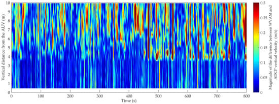 The difference between velocities obtained from the WVAM method and the ADCP were calculated by quantifying the standard deviation between the two. The standard deviations of the velocity components in x, y, and z directions were 0.09 m s−1, 0.07 m s−1, and 0.06 m s−1, respectively. The maximum error velocity of the ADCP vertical flow measurements estimated with the redundant transducer was ±0.10 m s−1 and Fong and Jones [5] indicated that the velocity measurements taken from an AUV-fixed ADCP typically has an uncertainty margin of ±0.1 m s−1. Thus, the standard deviation of the WVAM method results are within the uncertainty margin of ADCP measurements for x and z directions. The WVAM method provides the water column velocities at the vehicle while the ADCP velocity measurements are the averaged values of the first bins of the upward and downward looking transducers. The WVAM method was further validated by comparing the velocity measured by a stationary upward-looking ADCP moored to the seabed as discussed in Section 4.1.