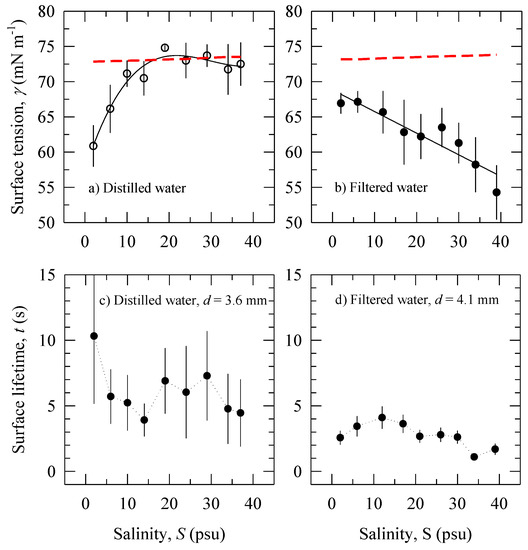 Surface tension γ as a function of salinity S (Table 2) with error bars of ±95% confidence interval in: (a) distilled water. The error bar at S = 19 psu is 0.37 mN m−1; (b) filtered water. The solid lines are regressions (cubic polynomial and linear, respectively). The dashed lines are surface tension of pure NaCl solutions γ0 calculated with Equation (A3) for each pair of salinity and temperature values (Table 2). Bubble surface lifetime t as a function of salinity S: (c) distilled water (bubble diameter of 3.6 mm); (d) filtered water (bubble diameter of 4.1 mm).