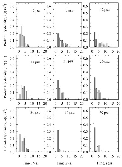 Bubble surface lifetime t varies widely for the narrow range of bubble diameters investigated here. Figure 3 shows the probability density functions of bubble surface lifetime t for different salinity obtained in the experiment with filtered water. It is seen that in fresh water (2 psu) t values vary up to about 10 s with a pronounced peak around 2 s. The widest range of possible t values, up to 13 s, is for salinity range of 6–17 psu with no pronounced peak. Further increase of the salinity, above 21 psu, confines the lifetime values to below 7–10 s. At the highest salinity (34 and 39 psu), most of the bubbles survive for less than 1–2 s. The variations of t for distilled water are much wider. The individual t samples (Section 2.2) in distilled water for all measured bubble sizes range between 0.4 and 35 s, as opposed to the range of up to 13 s for filtered water.