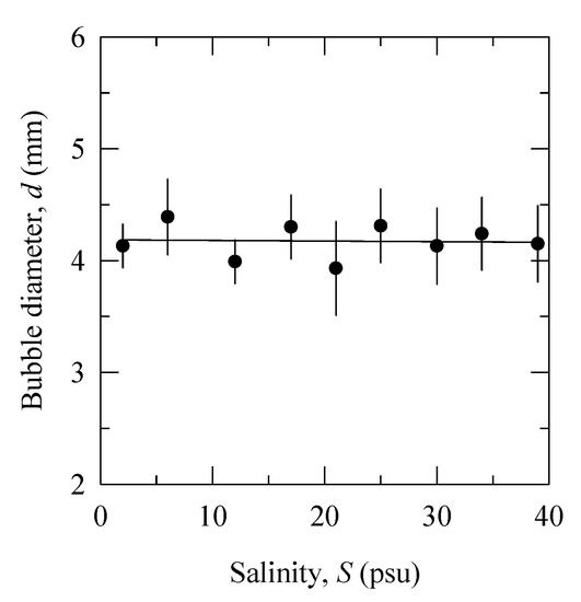 Figure 4 shows the bubble diameter as a function of salinity obtained from the experiment in filtered water using capillary diameter 2R = 1.5 mm (Table 1). The bubble diameter (mean value 4.17 ± 0.43 mm) is independent of salinity. This result is consistent with Quinn et al. [26] observations of a constant bubble aspect ratio y/x in aqueous solutions of different inorganic salts. We discuss possible explanation of the bubble size constancy in Section 4.3.