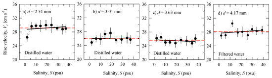 Bubble rise velocity Vr as a function of salinity S: Experiment in distilled water for different bubble diameters d: (a) d = 2.54 mm; (b) d = 3.01 mm; (c) d = 3.63 mm; (d) d = 4.17 mm for filtered water. Monitored variables are given in Table 2 and Figure 1a,b. The solid (black) lines are linear regression fits Vr(S) to the data. The dashed (red) horizontal lines show the mean Vr values for each bubble diameter (Table 1). The dotted lines connect the data points.