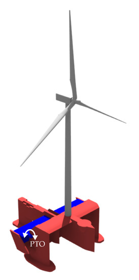 The WEC is constructed from a floating foundation (indicated by red color in Figure 1), a wind turbine and four wave energy absorbers (blue color), which utilizes the principle of pitching bodies.