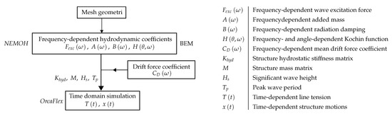 This study uses a modeling procedure as shown in Figure 2. The open source BEM code NEMOH [17] is applied for the calculation of the wave-structure interaction in the frequency domain, which implies linear potential theory with the assumptions of an inviscid, incompressible and irrotational fluid. In addition, the theory assumes incoming waves with low steepness and also structure motions with small amplitudes [17]. Particularly, the two last assumptions are put under stress for a WEC with compliant mooring in extreme sea conditions.