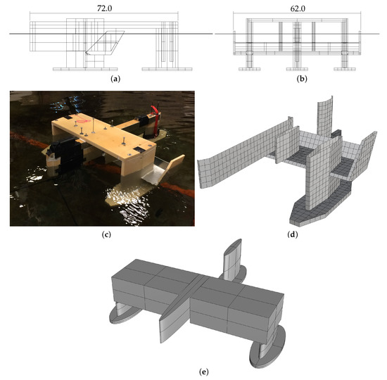 The drag coefficients were estimated from a simplified methodology, where the model was divided into a number of simpler shapes (cubes and ellipsoids), as shown in Figure 4e, for which the drag coefficients are known and can be found in, e.g., [28]. The total drag coefficient for the model was then determined by combining the coefficients from each shape, which then provided a very coarse estimate, as it does not account for the interaction between each shape. This methodology does not require the use of experiments or advanced CFD simulations and is, therefore, applicable for initial design.