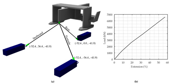 (a) Illustration of the considered mooring layout. The green shapes illustrate the load cells. (b) Mooring line stiffness curve determined during experiments. The values are presented at full scale.