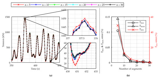 (a) Time series of segment convergence analysis with a zoom on the maximum and minimum tensions; (b) error of each analysis compared to the test with the maximum segment number. Note the different y-axes.