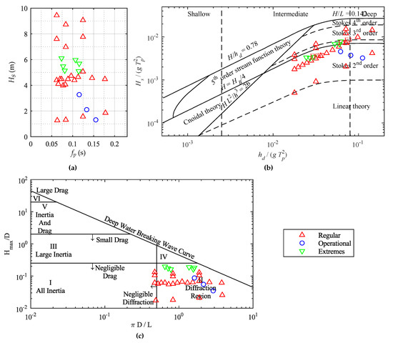 (a) Diagram of the sea states simulated in the wave basin; (b) the sea states plotted against the depth condition (x-axis), wave steepness (y-axis) and application areas of wave theories as defined in [35]; (c) the sea states plotted against wave force regimes as defined in [24], with D being the total width of the structure and not considering the open spaces.