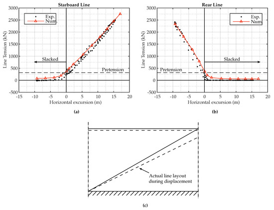 Quasi-static test results for experimental (Exp.) and numerical (Num.) line tension in the starboard (a) and rear (b) line; (c) illustration of the line layout during surge motion.