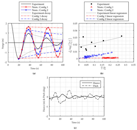 (a) Free surge decay test from experiments and Configurations 1 and 2 (with and without the drag element); (b) determination of linear and quadratic damping coefficients using linear regression [36]; (c) heave and pitch motion during the surge decay test.