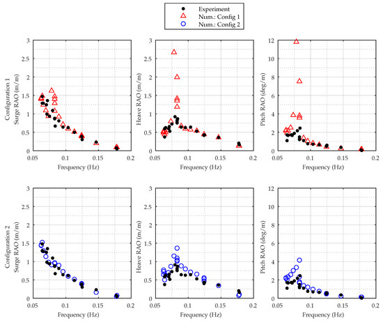 Considering the results from Configuration 1 (Figure 10a–c), there is some agreement with the experiments for most of the frequency range in all DoFs, showing the similar shape and amplitude of the RAOs. Both numerical and experimental RAOs show a peak at the coupled motion frequency at 0.078 Hz, but at this frequency, the most severe difference is observed. Due to resonance motion and lack of damping, most stress is put on the linear potential theory, and the numerical model highly overestimates the motion amplitude. For Configuration 2 (Figure 10d–f) with a drag element in all DoFs, better agreement between the experimental and numerical results is obtained, even at the peak of the RAOs. Still, there is an overestimation, but the error is decreased.