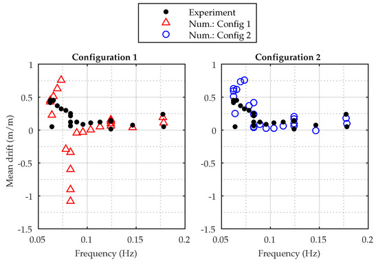 Figure 11 presents the results for the calculated and measured mean drift motion. In the numerical and experimental model, the mean drift during wave exposure is defined as the mean displacement from the static position. Considering the entire frequency range, both over- and under-estimations are seen, and due to the large error in the motion amplitudes at the peak frequency, Configurations 1 provides paramount drift motion errors at this frequency. A very large underestimation is seen with even negative drift, while the drift at the remaining frequencies shows a similar trend as for the experiments. Despite the better resemblance with experiments, Configuration 2 also shows some deviation from the experimental results. Considering Figure 11, it is seen how the drift motion is overestimated at the lowest frequencies and underestimated for many of the higher frequencies, but with a trend following the trend of the results. Despite this error, the motion amplitudes were shown in Figure 10 to resemble the experiments. Therefore, the error in the drift has proven not to affect the motion amplitude significantly.