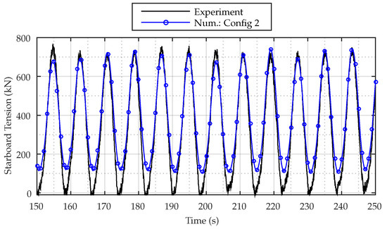 Considering the difference in measured and calculated motion response, especially in the drift motion, some error was expected in the calculated tensions, which are plotted in Figure 12 and Figure 13. Overall, the numerical model shows good agreement with the experiments, but with a high overestimation of the tension around the peak frequencies in Figure 13, a consequence of the high overestimation of the motions. As expected, this is most dominant for Configurations 1 (Figure 13a,c). For the low frequency waves, the tension amplitudes are underestimated, but considering Figure 12, which presents a direct time series comparison between experiments and Configuration 2, the peaks of the tension time series are similar for both models, indicating that the numerical model describes the maximum values well. A difference can be observed between the tension troughs in the figure, which explains the smaller amplitudes.