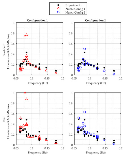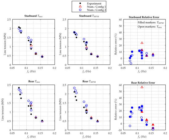 Since the numerical and experimental wave time series are not identical, but have similar frequency domain parameters, it is not possible to compare the maximum values directly. Considering Figure 15, there is good agreement in both configurations for the two tests with highest peak frequencies (operational conditions). These also have the smallest wave height and are the most linear waves. This agreement is seen in both the rear and starboard line. For the larger sea states, the error for Configurations 1 begins to increase significantly. For the considered sea states, it is not possible to show results for these two configurations for the sea states with frequencies lower than 0.1 Hz (the extreme sea states). Under these conditions, the motions became so large that the solver could not find a solution. The largest error is found for the sea states with peak frequencies around 0.12 Hz. Considering the tested sea states in Figure 7, these sea states also correspond to the steepest sea states. Still, the maximum deviation for Configuration 2 is 26% for the for the rear line, while it is only 11% for the starboard line.