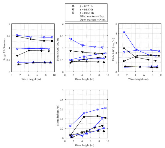 The figure clearly indicates that the calculated RAOs are highly influenced by the incoming wave height, and not linearly dependent on it. The magnitude of the deviation between numerical and experimental results seems more dependent on wave frequency than wave height.