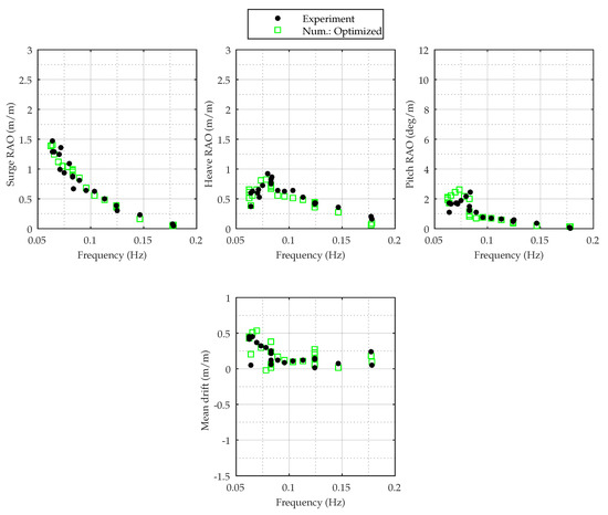 Since no decay tests are available for heave and pitch, it is more difficult to tune these values. The work in [13] presented a method that can be used, but the present study made a coarse sensitivity analysis to find values of linear damping in heave and pitch, which improves the model results for the regular tests. By adding 1000 and 4000 in respectively heave and pitch, the model showed better agreement with experiments. Figure 18 presents the motion RAOs for the optimized model. Clearly, the figure indicates that the additional linear damping is the main cause of difference between Configuration 2 and the experiments. By adding the damping, also the mean drift is better estimated.