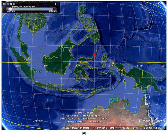 The site shown on Google Earth Images of the location of the project (red star) on decreasing scales: (a) Indonesia, (b) North Sulawesi, (c) Pulau Gangga.