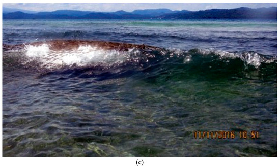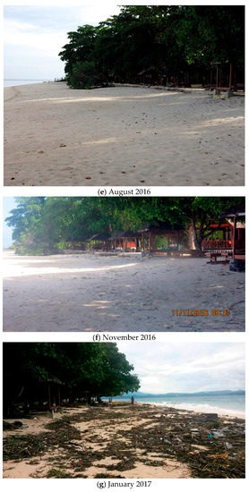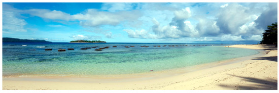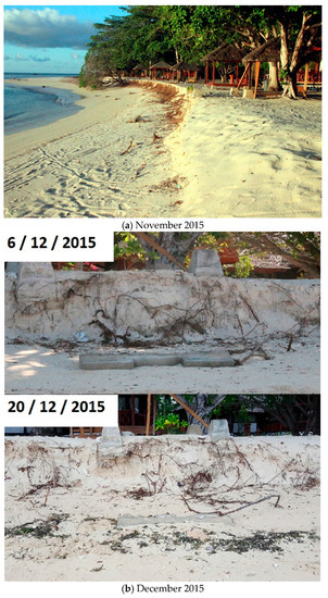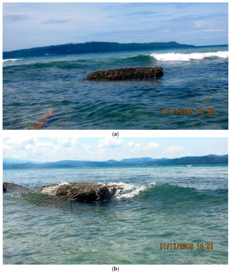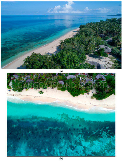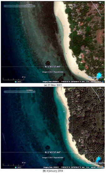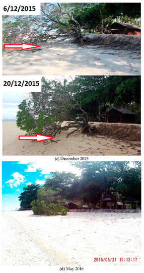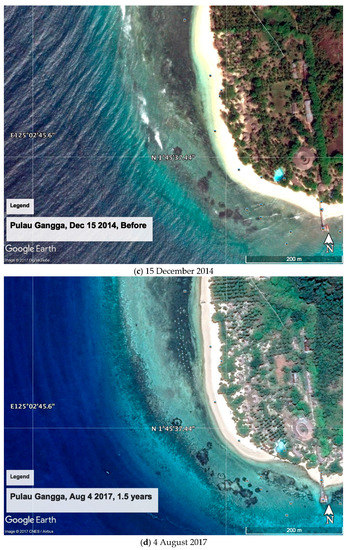Pulau Gangga, North Sulawesi, Indonesia, has suffered progressive beach erosion. The index maps show its location on various scales (Figure 1a–d), and Google Earth images show the rapid erosion of the beach between 2013 and 2014 (Figure 2a,b). The site is outside the typhoon belt because it is close to the Equator, but it is affected by both the Australian and Indo-China Monsoons. From around December through May the winds and waves are usually from the southeast. A strong southward tidally-modulated current normally sweeps sand from north to south at the site.