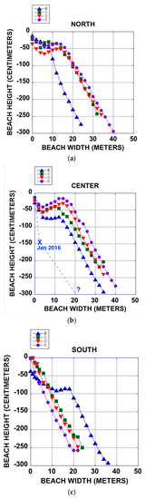 Beach profiles, measured at different times for the north (a), center (b), and south (c). The Zero reference datum for the central profile is the top of the concrete pillar foundation at the left of the December 2015 photograph. A 1.36 m vertical cliff stood at what is now the zero distance, based on measurements from photographs. Dates of measurements: X and dashed line estimate from January 2016; KEY to symbols: B upward triangle, 21 September 2016; C square, 11 January 2017; D downward triangle, 11 March 2017, E circle, 10 July 2017.