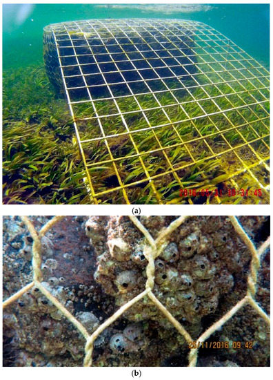 48 Biorock Anti Wave reefs were deployed in the sea grass beds in front of the eroding beach in January 2016. They were arrayed in twelve groups of four, each group powered by a single power supply located 100 m away on land, connected by electrical cables dug into the sand (Figure 3 and Figure 4a–d). They grow thickest at the bottom, and thinnest on top. The bottom 10–20 cm of the structures were always submerged at low tide, but above this they were exposed to the air for various periods, depending on the tidal cycle. Since structures grow only when and where submerged in salt water, the bottoms are always growing, while the top grows only when submerged, about half of the time. The gabion baskets were deployed in a grid pattern (visible from aerial images below) at low tide in shallow sand, seagrass, and coral rubble.