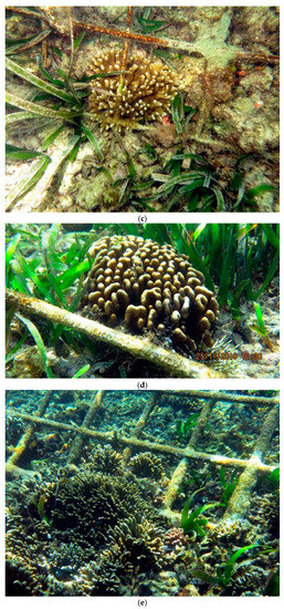There has been prolific growth of hard and soft corals all over the bases of the structures and in intervening areas (Figure 7a–e), prolific growth of sea grasses all around them, dense settlement and growth of barnacles, mussels, and clams on the rocks in the core of the BAW structures, and a rapid increase in juvenile fish and echinoderm populations. In addition, there has been prolific growth of sand-producing calcareous green and red algae around and between the structures.