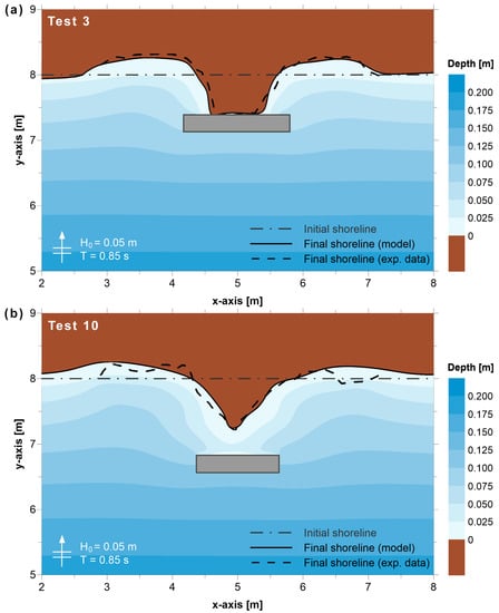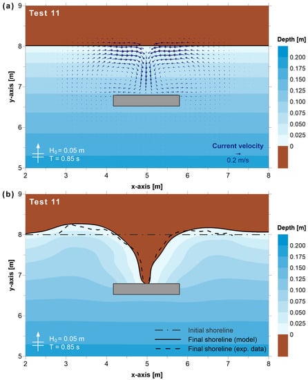 Figure 2 shows the initial wave-induced current velocity field and the comparison between the computed and measured shoreline evolution data for Test 11 of Ming and Chiew [21]. The presence of the breakwater leads to the formation of two opposing eddies in the area behind it, as currents move towards the sheltered area along the foreshore from both sides of the structure. A secondary cause of the observed circulation pattern is the mean sea level gradient between the illuminated and sheltered areas due to diffraction effects, while the representation of swash zone hydrodynamics by the model should also be highlighted (see also Section 2.2). Regarding morphology evolution, the model results are in good agreement with the measured data of Ming and Chiew [21], satisfactorily representing the formation of the tombolo in Test 11 (Figure 2b), as well as the formation of the tombolo and salient in Tests 3 (Figure 3a) and 10 (Figure 3b), respectively.