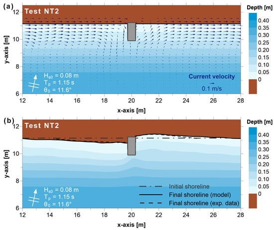 Figure 4 shows the initial breaking wave-induced current velocity field and the comparison between the computed and measured shoreline evolution for the single groin test (Test NT2) of Baidei et al. [22]. The sediment accretion updrift of the groin-type structure results in an advance of the shore, while the lack of sediments at the lee of the groin leads to a retreat of the shore; shoreline evolution is well-reproduced, with model results and measurement lines practically overlapping.
