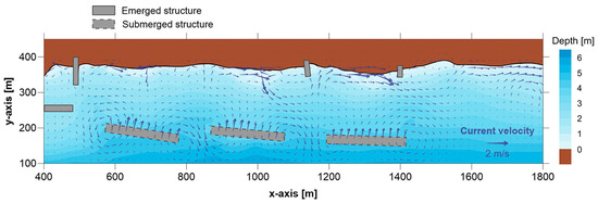 Figure 5 shows the breaking wave-induced current field for the prevailing SE-S waves. The submerged breakwaters allow some wave transmission and overtopping that cause an additional supply of water behind the structures, which is taken into account by the circulation module and affects the current field. This net transport of water into the lee zone causes a water level rise and is balanced mainly by outgoing currents at the heads of the structures. Consequently, the main flow pattern is characterized by an onshore flow over the submerged breakwaters, an offshore flow at the gaps between them (eroding rip currents), and nearshore eddies similar to those formed in the case of emerged breakwaters (although with lower relative intensity). The first two flow patterns do not exist in the latter case, while the third flow pattern is not extended up to the structures, where onshore flow leads to the formation of—more intense—opposite direction eddies.