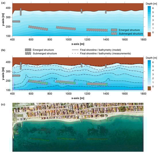 Following its validation for laboratory experiments, the presented integrated model was applied to a real case study of a coastal engineering project regarding the protection of a beach by using detached submerged breakwaters. The study area is located in the Region of Central Macedonia, Greece, at a sandy beach north of the fishing port of Katerini (Figure 1). The area has been facing coastal erosion problems for well over 30 years, which started after the construction of the harbour seen in the left part of Figure 1 (1980–1984). As a result, and due to the prevailing SE winds, the coastal zone south of the fishing port showed strong accretion, while the coast north from the port was eroded, with a shoreline retreat in the order of 20 m; the erosive phenomena stretched over a zone of 800 m north from the port. In order to reverse erosion, a groin field consisting of 13 rubble mount groins was constructed (1990–1997). The project not only failed to further protect the beach—since additional erosion occurred in between the constructed groins—but it also transferred coastal retreat northwards. Furthermore, the semi-closed basins that formed between the constructed groins (being in the non-tidal Mediterranean Sea) caused significant environmental problems regarding water quality due to the limited renewal rates. In 2010, a new coastal protection project was designed and constructed; the groin field was replaced by a set of three 200 m long submerged breakwaters placed at a distance of approximately 200 m from the coast, and the gaps between the structures were approximately 110 m. The breakwaters were designed to have transmission coefficients in the order of 0.4 (Kt ≈ 0.4). In addition, a beach nourishment project was also designed and applied to restore the beach to its previous condition. Bathymetry measurement data for the area are available for the period right after the completion of coastal works (beach nourishment and construction of the submerged breakwaters), as well as for three years later [46].