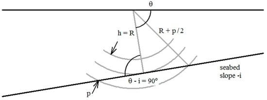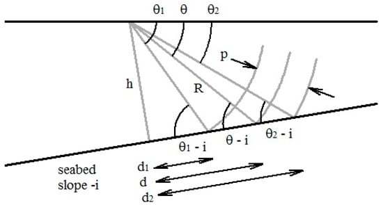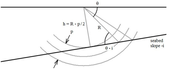 Contact is first made with the seabed when at an incident angle . As the pulse continues to propagate, the incident angle remains constant until (Figure 3). For this condition: and . Substituting into Equation (8) yields: