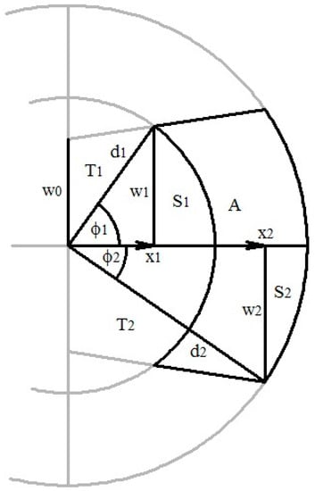 The area of a planar seabed ensonified by the sonar pulse lies within an annulus defined by the circles of radius and and the fore-aft sonar angular beam width (radians), which truncates the annulus into a pair of partial annuli: a principal (Figure 4) and its conjugate (not shown in Figure 4).