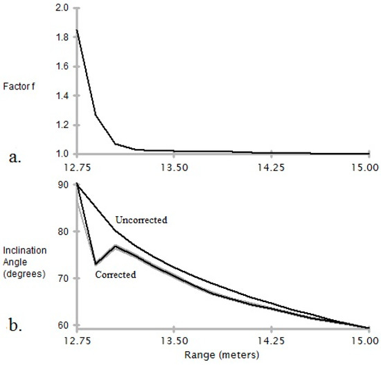 The values for corrected inclination angle (Figure 6b) converge with the values for the uncorrected or effective inclination angles relatively slowly. This is because though the directions of vectors and increasingly diverge, the effect of on the direction of the vector sum of and remains relatively large, despite the decreasing magnitude of the vector . Note that the effect of the direction of vector sum of and on the direction of is considerably more important than the effect of variation in the directions of elements of across the principal area on the seabed ensonified by the sonar pulse.