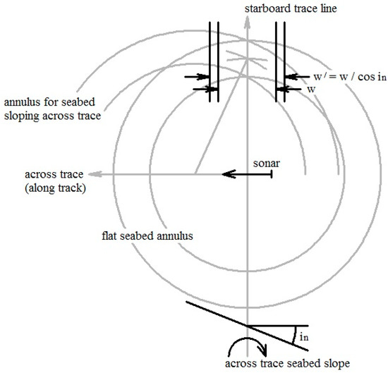 The effect of an across-trace slope may be regarded as two-fold. First, the annulus of the seabed for a flat seabed within which the seabed is ensonified is transformed into an annulus with a center offset from immediately beneath the sonar vehicle to a position on the seabed fore or aft of the sonar. In the vicinity of the locus of a narrow sonar pulse along a trace on the seabed, and for small seabed slopes, the transformation from the annulus on a flat seabed to one sloping across-trace is achieved approximately by a shear without change in surface area. Secondly, the width of a sloping seabed surface exposed to ensonification by the sonar pulse is wider than that of the exposure of a flat seabed by a factor .