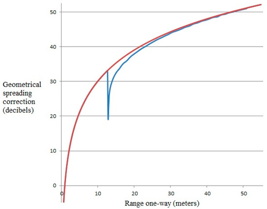 Graphs of geometrical spreading correction (decibels) for a single sonar trace (Figure 6) imaging the seabed as a function of range (meters). A correction appropriate to apply as a far-range approximation is shown in red, and a more accurate correction incorporating the second term on the right hand side of Equation (56) is shown in blue.