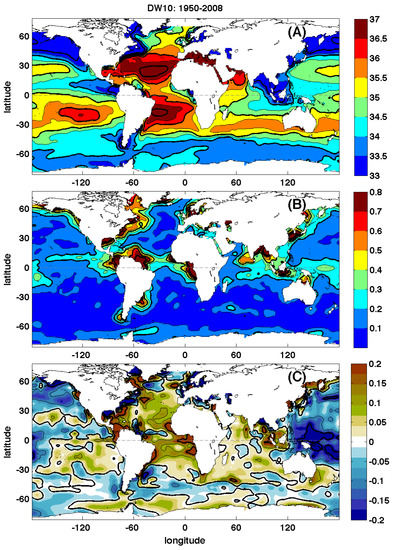 Mean and trend for the 1950–2008 period using EN4 data equivalent to Figure 5 of Durack and Wijffels [13]. (A) 1950–2008 climatological mean surface salinity. Contours of salinity every 0.5 are plotted in black with thicker contours every 1; (B) 1950–2008 climatological standard deviation of surface salinity. Contours of salinity standard deviation every 0.1 are plotted in black with thicker contours every 0.2 (C) 50-year linear surface salinity trend (pss (50 year)). Contours of salinity every 0.2 are plotted in black.