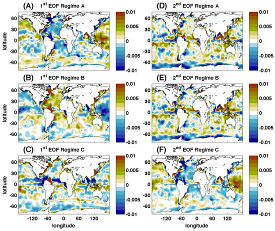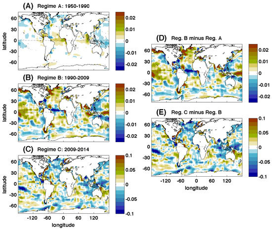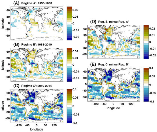 As was the case with the means, the trends of the two first regimes (A’ and B’) of the combined time series (Figure 9A,B) were equivalent to the trends extracted from the original dataset (Figure 4) for Regimes A and B. The trend for Regime C’ (2010–2014, Figure 9C) differed in magnitude and spatial structure from the trend for Regime C of the original EN4 dataset (2009–2014, Figure 4C). The Regime C’ trend was positive in the Equatorial Pacific and Atlantic while having a negative trend in most of the rest of the oceans with large negative values especially in the North Atlantic. The trend for Regime C’ was likely the effect of changes in the processing methodology for global SMOS data [37,38].