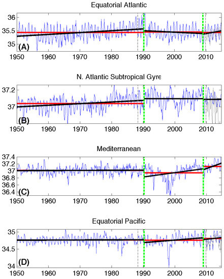 The question we are trying to address in this study is whether the SSS changes are due to: (1) a regime shift in which the SSS has moved from one equilibrium state to another (maybe even several regime shifts); (2) a constant SSS trend (no new equilibrium has been achieved); (3) a varying SSS trend (not only is SSS changing, but the rate of change varies); or (4) a combination of the above. The consequences of the SSS changes being associated with mean or trend changes have repercussions beyond the SSS evolution and affect the global water cycle [5,6,15]. Our goal is to isolate different regimes to provide understanding of potential future global cycle changes.
