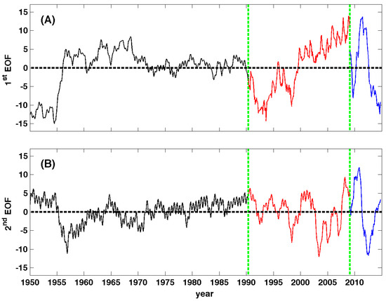 Time series of modes of variability of the EN4 1950–2014 salinity. First (A) and second (B) modes for Regime A (1950–1990), B (1990–2009) and C (2009–2014). The green dashed lines indicate the separation (breakpoint) between regimes.