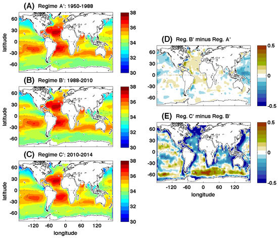 Mean surface salinity for the three regimes estimated by the EM procedure using combined EN4 and SMOS data: (A) Regime A’: 1950–1988; (B) Regime B’: 1988–2010; and (C) Regime C’: 2010–2014. The differences between the means of Regime B’ and A’ (D) and Regime C’ and B’ (E) are also included.