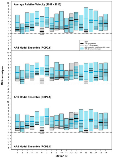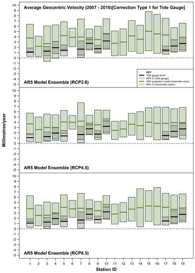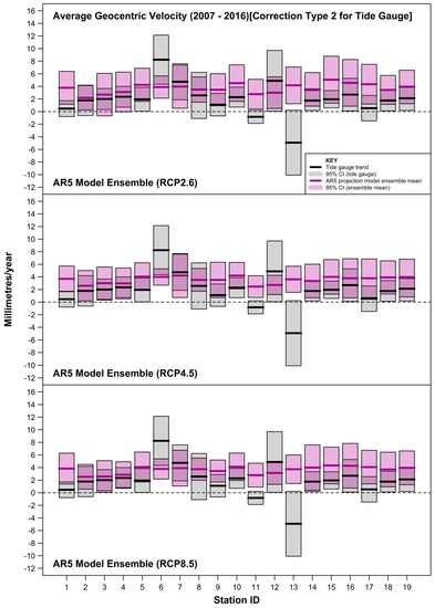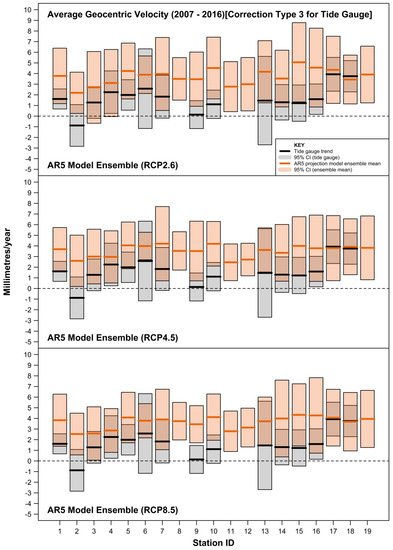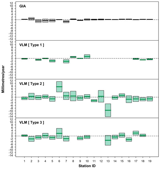 - estimating and accommodating the ubiquity of VLM resulting from multiple origins (including tectonics, subsidence, etc., as well as GIA) embedded within tide-gauge records. As evident in this study, co-located GPS measurements are not available for many tide-gauge sites or are at best quite short records (often <10 years) [29,30]. The more complete and longer VLM estimates based on the method of Ostanciaux et al. 2012 [31] are reliant on satellite altimetry data [14] on a spatial resolution grid of 0.25° × 0.25° and could be a maximum of ≈20 km from the tide-gauge site. Similarly, the AR5 approach of correcting projection outputs for GIA to better approximate mean sea-level rise “relative” to the land ignores the many other VLM origins present at tide-gauge sites. This is highlighted clearly in Figure 7, where the GIA estimates at Balboa [ID = 6] and Ko Taphao Noi [ID = 13] differ markedly from the actual VLM observed via differing techniques. At both sites, the estimated GIA is <0.2 mm/year, whereas the VLM associated with the tectonic uplift of the Panama Arc at Balboa [35] and subsidence due to groundwater and aquifer mining at Ko Taphao Noi [36] are of the order of several mm/year;