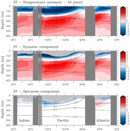Temperature anomaly δT (°C) between CTL and W15 simulations at latitude 0.5° N after 1 year of OTEC activity (upper); components of δT (determined with the method of Furue et al. [33]) are also shown: dynamical (middle) and spiciness (lower). Color scale is the same as in Figure 4. The light grey shading in the middle and lower panels indicates areas where the components are undefined; this is because the decomposition requires matching density surfaces between W15 and CTL, and the near-surface cooling from OTEC activity has resulted in the absence of light density water in W15. Also shown are σθ contours from CTL.