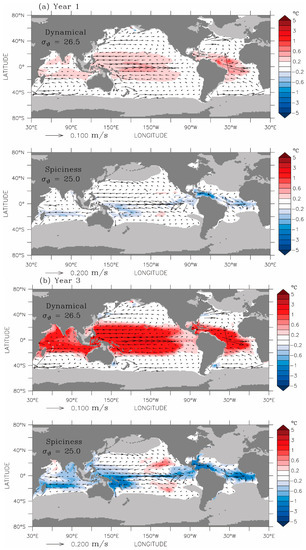 Based on the fundamentals of ocean dynamics, a localized potential density perturbation in the ocean would lead to an unbalanced pressure field, thus an unbalanced ocean state. The adjustment process towards a new balance involves the generation and propagation of particular types of ocean waves, such as Rossby waves, and equatorial and coastal Kelvin waves. These waves spread the density disturbance, and along with it, are able to modify the temperature and salinity fields of remote regions far away from the region of initial perturbation. Temperature and salinity anomalies can also be advected by the flow field in the same way as passive tracers; this occurs when the two properties happen to vary in a compensating manner, for example from warm and salty to cold and fresh, such that they do not result in a change in potential density. Furue et al. give details on how to separate δT into a wave component (dynamical anomaly) and an advective component (spiciness anomaly) [33], and provide examples on how they propagate in the tropical Pacific. These components are displayed in the middle and lower panels of Figure 5 and Figure 6. We see that the dynamical anomaly plays a dominant role, as expected given the dynamical nature of OTEC perturbations.