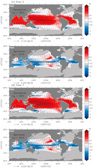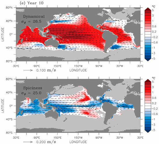 Figure 7a,e contrasts the ways in which the dynamical and spiciness components of the temperature anomaly spread in time throughout the domain, on density surfaces σθ = 26.5 for the dynamical component (upper panel) and σθ = 25.0 for the spiciness component (lower panel). These are the surfaces where the components have their respective maxima along the Equator in the Pacific sector, positive for the dynamical anomaly and negative for the spiciness anomaly (middle and lower panels in Figure 6). The snapshots in the sequence correspond to simulation times representing 1, 3, 5, 7 and 10 years after the onset of OTEC deployment, respectively. Arrows represent the ocean circulation in CTL. In Figure 7a, merely one year after the start of OTEC operations, the warm dynamical anomaly is confined within the OTEC zone. By Year 10 (Figure 7e, upper panel), its magnitude has gradually increased and the region of anomaly greatly expanded. In particular, there is clear indication of its poleward extension along the eastern boundary in each basin, opposite to the direction of flow. This represents the action of Kelvin waves. Within the equatorial wave guide (in a latitude range approximately 4° wide across the Equator), equatorial Kelvin waves propagate eastward, spreading the dynamical component to the eastern boundary, where they split into poleward-travelling coastal Kelvin waves to reach the coast of Alaska and the tip of South America in the Pacific Ocean, the southern coast of Australia in the Indian Ocean, and South Africa in the Atlantic. In the high latitudes of the North Atlantic where the surface mixed layer water is heavier than this density surface (light grey, see also the contours in Figure 4), the warm dynamical anomaly reaches the high latitudes along denser surfaces (e.g., σθ = 27.5, not shown). The signatures of Rossby waves can also be seen in this figure. Rossby waves are reflected from the coastal Kelvin waves to propagate due west. Since the phase speeds of Rossby waves are fastest in the tropical latitudes and decrease sharply towards the high latitudes, the westward extension of the warm anomaly narrows sharply poleward, which is seen most clearly in the Pacific Ocean. Within the OTEC zone and outside the equatorial wave guide, OTEC activity can also generate Rossby waves that carry temperature anomalies to the western boundary, where they turn equatorward as coastal Kelvin waves, and then eastward as equatorial Kelvin waves which then split into poleward coastal Kelvin waves at the eastern boundary. Rossby and Kelvin waves would propagate cool dynamical anomalies on lighter potential density surfaces in the same manner as for the warm anomalies on denser potential density surfaces. The main difference is that lighter σθ surfaces rise to intersect the ocean surface at lower latitudes, bringing a cool anomaly to the tropical region, while the denser σθ surfaces affect the ocean surface temperature at higher latitudes. This explains the temperature anomaly distribution shown in Figure 4 at the ocean surface.