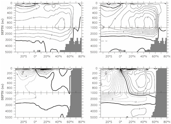 The Atlantic Meridional Overturning Circulation (AMOC) is dominated by a deep clockwise cell in ϕ(y,z) (Figure 8, upper-left), resulting from the northward flow of near-surface warm water, the sinking at high northern latitudes (~60° N) due to surface cooling, and the southward flow of the cold North Atlantic Deep Water (NADW) at depth. This circulation cell transports much of the heat gain in the tropics to the high northern latitudes, and thus plays an important role in regulating the climate system. One estimate of the annual mean transport strength is 18.7 ± 5.6 Sv [34], based on field data collected along 26.5° N during a one-year period (March 2004–March 2005). In experiment CTL, we obtain a lower value of around 12 Sv, but well within the range of 8–28 Sv produced by simulations from a collection of ocean-ice models [35].