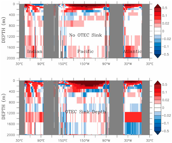 To further elucidate OTEC specific effects, we ran two numerical experiments similar to W15, but with implementation areas limited to either the Atlantic, or to the Indo-Pacific, as defined in Rajagopalan and Nihous [18]. The areas covered by these separate OTEC regions are quite different in size, i.e., 21 × 106 km2 for the Atlantic versus 95 × 106 km2 for the Indo-Pacific; therefore, the single value of the OTEC cold seawater flow rate per horizontal area used here, wcw = 15 m year−1, corresponds to relatively much larger overall OTEC flow rates in the Indo-Pacific. This might skew or complicate a priori a comparison between basins, and simulations with two different values of wcw might be considered in the future. When separate OTEC power production maxima were determined for the two regions [18], however, with a value of wcw twice as large in the Atlantic as in the Indo-Pacific, reported environmental effects did not qualitatively contradict the foregoing results [18] (Figure 5 and Figure 6).