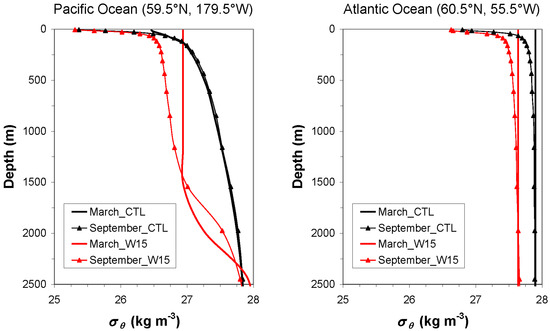 March and September averaged potential density profiles with or without OTEC at selected northern high-latitude locations: Pacific Ocean (left) and Atlantic Ocean (right).